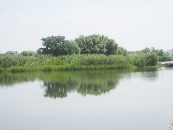 ![]() 在来種のマコモやヨシ、セイタカヨシが茂るワンドの植生。後方の大きく育ったヤナギやセンダンなどの木本は、本来起こるべき増水・氾濫による中州の攪乱がなくなった証拠。 | ![]() いったん水を抜き、可能な限り外来魚を除去したワンド。増水時に隣接するワンドからの溢流水を防ぐため、周囲を土嚢で囲っている。 | |