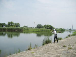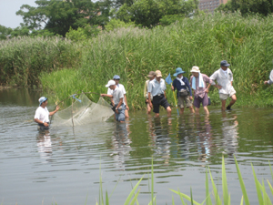 ![]() 四手網をしかけ、マコモの草むらにいる魚を追い込む。 1回目:残念!1匹もかからず。2回目:ブルーギル2匹。これが今のワンドの状態。 |