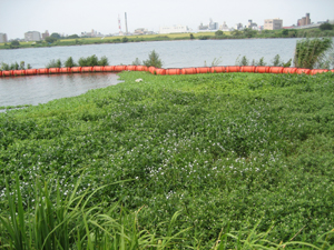 ![]() 一面に広がるナガエノツルノゲイトウ、ミズヒマワリ(白い花)、ウォーターレタス(開水面近く)などの外来植物。これらが繁茂すると溶存酸素が少なくなり、魚はすめない。この場所も、かつてはイタセンパラの棲み家であった。後方のオイルフェンスは植物が本流へ広がらないように設置。 | |