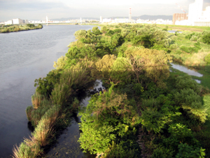 ![]() 菅原城北大橋から見た城北ワンド群。 このあたりには、05年には7000羽、06年には3400羽、今年は1500羽のツバメが集まっ た。5年ほど前までは、夕方にはツバメで空が真っ黒になったという。 | ![]() 中州が森林化し、ヨシ原が衰退。 | |