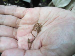 ![]() ハリガネムシ。 「どっちが頭だ?」「形状記憶合金みたいだ!」 ハラビロカマキリに寄生する奇妙な虫にいろんな声が飛び交う。 |