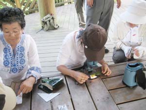![]() 捕らえた虫を小型実体顕微鏡で観察。 脚の精巧なつくりに感嘆したり、案外愛嬌ある顔に笑ったり、蝶のりん粉のしくみにびっくりしたり。時間がいくらあっても足りないくらいです。 |