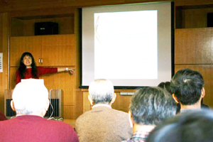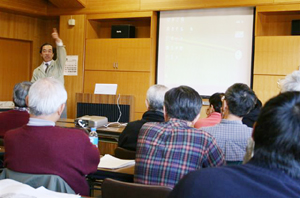 ![]() 里山の成り立ちと変遷、これからの保全や活用のしかたについて、古代の歴史に遡ってわかりやすく説明する常俊先生。 |