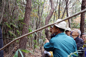 ![]() 五月山の森林の現状とその保全についての考えや、五月山公園を中心に保全活動をしている五月山グリーンエコーの活動状況を説明する池田市建設部公園課課長・清水敏氏。