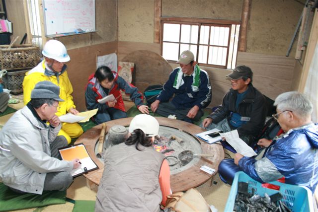 ![]() 「企画運営」の2日目、テーマは決まったが具体的にどのように進めるか。 奥の谷里山保全の拠点となっている小屋の囲炉裏を囲んで打ち合わせ。 |