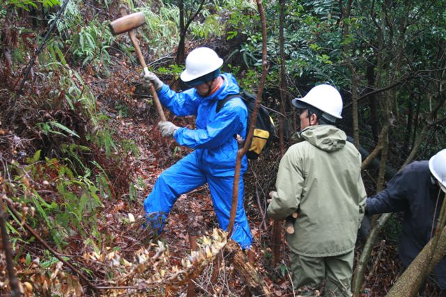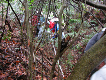 ![]() 1班、2班のテーマは常緑照葉樹が生い茂った雑木林の下樵り。 初めに下樵りを行う領域(コドラート)を決めるための杭打ち作業(1班)。 |