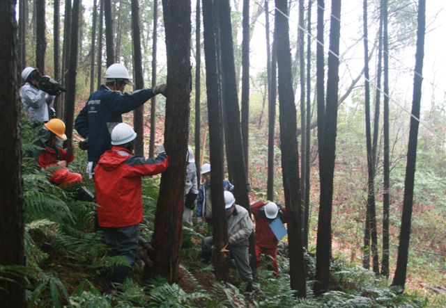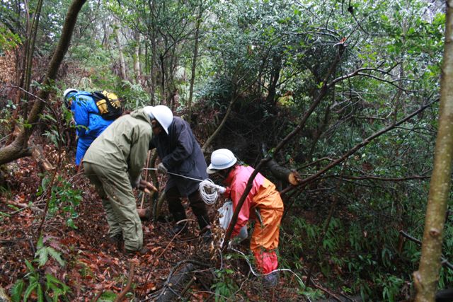 道の補強用木材に使用するためのヒノキ(幹の途中で2本に分岐)を伐倒する。田淵先生の指導で伐採作業。 |