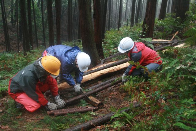 ![]() 杭に使用するために、伐採した木材の細い幹を切る。幹の太い部分は路肩が崩れるのを防止する補強材に使用する。 |