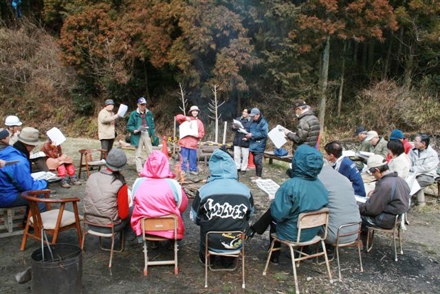 ![]() 前回まで3回にわたって行ってきた受講生による「企画運営」、今回はその成果の発表会。第2班は雑木林を10m×10mの範囲で「下樵り」を行った。他班の受講生、講師、スタッフの前で発表。 |