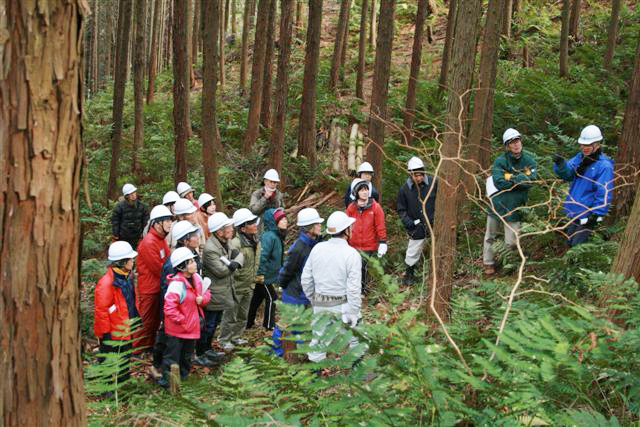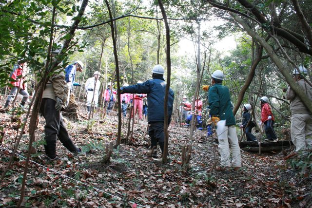 ![]() 延長する観察路の補強に間伐する必要のあるヒノキ材を伐採して使用した。 伐採の方法について現地で説明する班員。 |