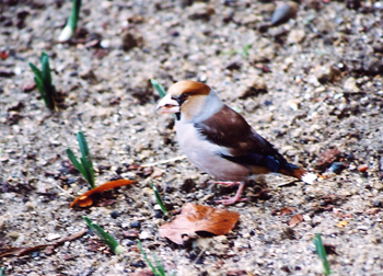 18cmデブッチョ。クチバシは太くて短い。ツィーツィー チョッチョッと、短いが鋭く鳴く。モミジの実が大好物。首のまわりに灰色の輪がある。