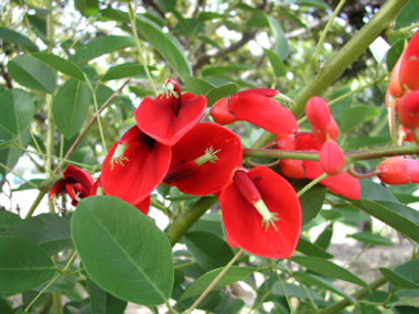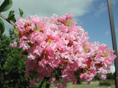 夏も終わりにちかづくと、花の種類も減って来ますが、アメリカディゴ(かいこうず海紅豆)の花が咲いてました。鹿児島県の県花が六甲アイランドで見られます。 近くで、原色系と違って、淡い彩色の「百日紅(さるすべり)」の花を見付けました。 花期が長いので、こんな名前が付いたのでしょうか。(2002.8.20.)