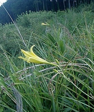 盆休みの山歩きで初めて「ユウスゲ」に出会いました。毎年何回かここに出かけますが夏は初めてでした。 この場所はやや海抜200M前後の平坦で湿気のある狭い草原です。付近には、「ヌマトラノオ」が咲いています。また 花が終わり種をつけた「花しょうぶ」や湿地の雑草も観察されます。