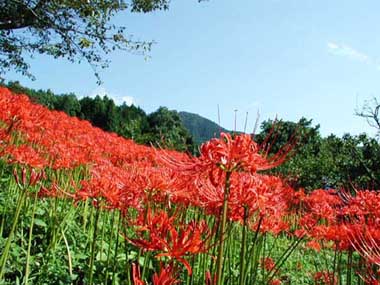 彼岸花は、大抵は見下ろして眺めていますが、角度を変えて青空をバックにして眺めてみると、真っ赤な花色が、下草の緑と真っ青な空との間で燃え立つように浮かび上がり、大変美しく鮮やかです。仏隆寺門前の斜面一帯が、紅蓮の炎に包まれているような見事な眺めでした。