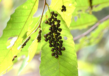 山道を歩いているとプーンと嫌な臭い。カメムシの臭いに違いないと辺りを見回すと、クヌギの葉の裏にマルカメムシの集団。まだ暖かいのでこのように葉に留まっているが、寒くなるとどこか適当な越冬場所を探すようである。