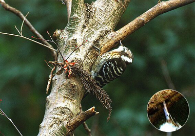 エナガなどと混群で木から木へと移動するコゲラをよく見かけますが、いつも一番あとまで残っているひょうきん者。今日は単独で一心不乱に木を突つき採食していました。円内写真は嘴のところを拡大したものですが幼虫らしきものを引っ張り出しているのが分かります。