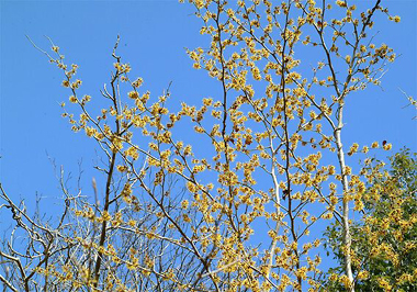 快晴に映えるマンサク。まだ冷やりとするが春は確実に近づいている。