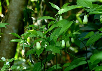 コメント:五重塔やお寺の軒にぶら下げられた宝鐸(ほうちゃく)に似るところから付けられたホウチャクソウ。樹木の下などの薄暗いところに生え、ほんの短い期間宝鐸を思い起こさせてくれます。
