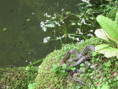 金剛山山頂の転法輪寺境内にあるひさご池では毎年この時期にモリアオガエルの産卵が見られます。その孵化を狙ってか、この時期は蛇も多く集まります。この日は、そんなに広くないこの池の周りで3匹の蛇の姿が見られました。この蛇のちょうど真上にメレンゲをといたような卵があり、そこから落ちてくるオタマジャクシを、蛇はじっと待っているのでしょうか?帰りにウワバミソウをつんでとろろにして食べた私は、両方食べたような気にはなりませんでした。美味しかった!!