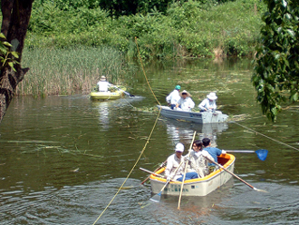 6月26日(日)に、2003年のピアノ池ヒメガマ刈り取り大作戦が、梅雨の晴れ間に行われました。 撮影者:高畠耕一郎 さん(写真@〜H)・栗谷至 さん(写真I) 撮影場所:吹田市・ピアノ池 (2003.6.26.) |