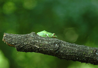 小池に垂れ下がる木の枝にはモリアオガエルの卵塊が数個。