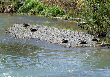 この日は暖かくカルガモが砂礫地で休息中、その姿が面白い。坐りこんで頭を後に向け背中の羽毛の中に潜らせている。皆同じポーズである。でも時々瞼を開け周りをちゃんと監視しているのです。