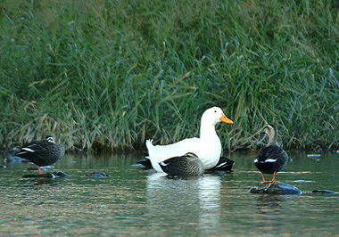 猪名川で冬鳥を観察しているとその中に巨大なアヒル。近くのカルガモと比べると優に1.5倍、体重にして3倍以上あるのでは。大阪市立自然史博物館にお尋ねするとアヒルは普通鴨よりひとまわり大きい位だそうですが時にはこんな巨大なアヒルもいるそうです。