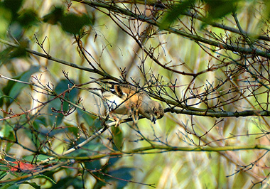 一昨年以来見なかったアトリ、7羽ほどの群が若いモミジの枝で盛んに採食中。 よく見るとあのくるくる回って落下する竹とんぼのような果実(翼果)を盛んに食べているのです。