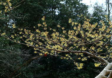 小さな池の淵のロウバイの花が終わりに近づいてきましたが、その隣のマンサクがこのところの暖かさであっという間に満開になりました。逆光で見ると金色の花が咲いているようです。