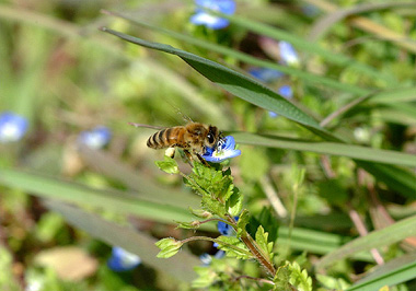 今日も暖かい一日。セイヨウミツバチと思われる蜜蜂がせっせと花粉と蜜を集めています。こんな小さなオオイヌノフグリの花にも訪れてくるのですが、その滞留時間の短いこと。1秒ほどでしょうか。