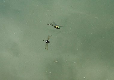池ではたくさんのコノシメトンボが小さな縄張りを形成しています。そこへ大きなオオヤマトンボが進入して来ました。それでも小さなコノシメトンボは果敢にも立ち向かって行きます。