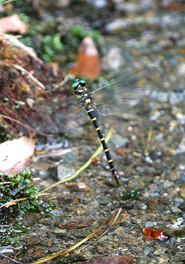 浅い清流で突然オニヤンマの産卵が始まりました。水面上15cmほどの高さから腹部をほぼ垂直に立て産卵管を底の砂泥を突き刺さしては抜く上下動を繰り返し産卵しています。このダイナミックな産卵、ほとんど休むことなく7分間も続きました。