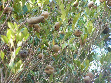 イスノキの虫えいです。虫えいが鈴なりになっているのは珍しいのでは。 虫が出て行った穴を吹くと、「ヒョー、ヒョー」と鳴るので「ヒョンノキ」とも言われます。