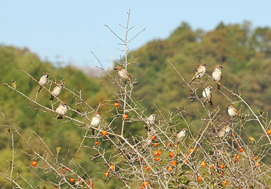 田んぼに干していた稲穂はもうすっかり片付いているのですが、落穂があるのでしょうスズメが群がっています。傍を通ると一斉に近くの木々に避難します。でも難が去ればまた田んぼに群がります。