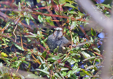ヒヨドリは好物の実がなくなったので畑で白菜、ブロッコリー、チンゲンサイなどの菜っ葉を食べています。時にはアケビ、マンリョウの木の葉も食べているのが見られます。この時はまた違った木の葉を食べていました。何の葉かちょっと判りませんでした。