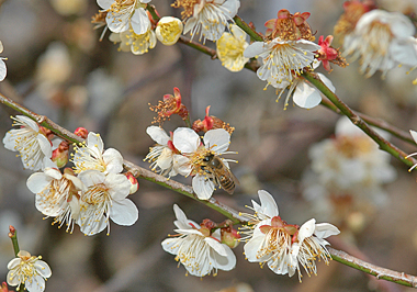 ここ数日冬に戻っていたものがこの日は気温が急上昇。蝶やアブが飛び交いミツバチもせっせと花粉集めに余念がない。この梅にも数十匹のミツバチがうなりを立てて飛び回っていた。 見るとほとんどがニホンミツバチである。