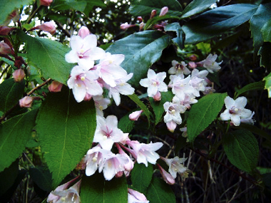 この時期、山地を彩るタニウツギ、春の花が散ってしまった後の山辺を美しく飾って いる。