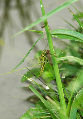 今までハラビロトンボの羽化を見た事がない。 その朝田んぼに着くと、土手の草によじ登って羽化しているハラビロトンボを見つける。上にもうひとつの羽化殻が見える。おそらく前日以前に羽化したものであろう。 それにしてもこの田んぼ、昨年は畑で水がなかったはず、幼虫(ヤゴ)はどうして過ごしてきたのだろうか。
