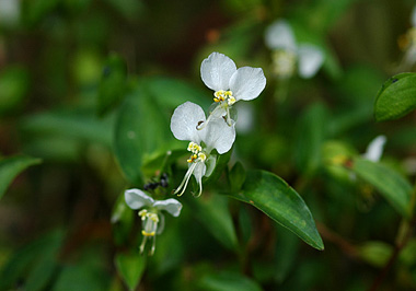 辺りはツユクサの群生。その中で一箇所白いツユクサが咲いている部分があります。 その境目辺りは淡水色の花になっています。 もしかすると農薬か何かで変わってしまったのかもしれません。