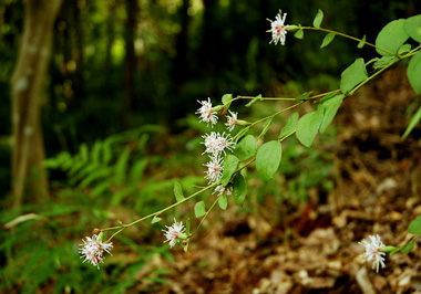 薄暗い山林を歩いていると少し明るいところにコウヤボウキの花、