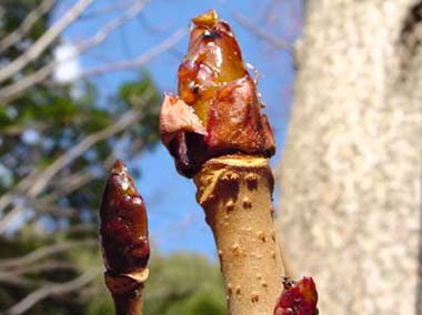 透明粘着性蝋物質でコーティングされた冬芽が陽光を受けて艶やかに光っていました。 その幹には1年間のあり姿の痕を見ることができます。