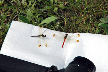 観察途中、カメラのレンズを置いた敷物に雌雄のリスアカネが日向ぼっこ。 レンズを取り上げると飛んでしまったが、その場を離れるとまた戻ってきて日向ぼっこ。 暖かくよほど居心地がいい場所なのであろう。