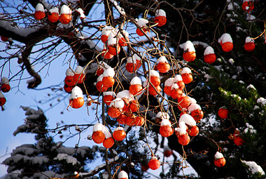 まだあちこちに残る柿の実に綿帽子のよう雪がかぶっている。