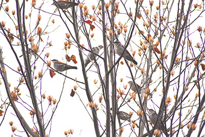 40羽ほどのツグミの群がユリノキにとまっている。皆ほぼ同じ方向を見ている。 移動の途中なのかそ、れとも当地に居つくのか? 久々に見るツグミの群。
