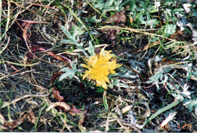 水遠池堰堤のカンサイタンポポ1株がやっとの思いで開花し始めた。寒波の影響で昨年よりも約1ヶ月も遅い開花となったが、花も縮みあがっていて、まだ春は遠いと感じられた。