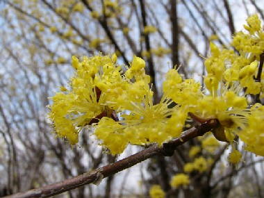春の訪れを告げるサンシュユの花、近づいて見るときらびやかに花弁を広げていた。 まだあたりに緑の色も少ない時期に野山を彩っている。