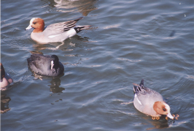 蓮真池にオオバンたちが飛来している。 いつもは岸より離れた所を遊泳しているが、この日はヒドリガモたちの中に入って採餌していた。