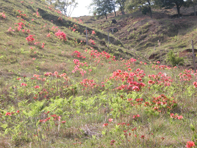 この連休、奈良・若草山の山頂から急峻な東斜面を下ってくる途中、縦横に走るシカ道の中に点々と咲く思いもかけずたくさんのレンゲツツジを見ました。 毎年、連休には藤の花見に奈良公園へ出掛けるのですが、そういえばここ数年、この時期にこちらの方まで来たことがなく、これほどたくさんのレンゲツツジがあることには気がつきませんでした。
