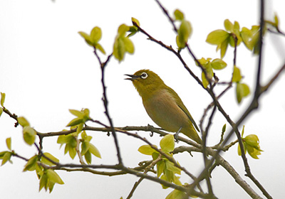 近くで盛んにさえずる鳥の声。辺りを探すと木の枝で一心不乱に囀っているメジロ。近づいても鳴きやまない。こんなに永くさえずるメジロに遭ったのは初めて。