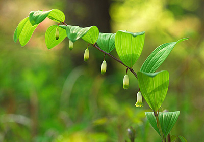 新緑で柔らかい日差しになった林床ではアマドコロが花をつけ始めた。